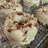 Vanilla Donut with a sweet + Salty maple glaze. Topped with toasted pecans