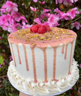 Shipping unavailable. This cake is for lovers. If you're solo, loving yourself ABSOLUTELY counts. Rich chocolate cake, layered with fresh, tart raspberry jam. vanilla buttercream & drizzled with that same fudge. Naturally colored with dehydrated fruits. Topped with toasted pistachios.