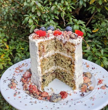 Shipping unavailable. 3 layer gluten free and vegan berry-fetti cake layered with cream "cheese" frosting, our berry crumble and fresh berries. All natural coloring.